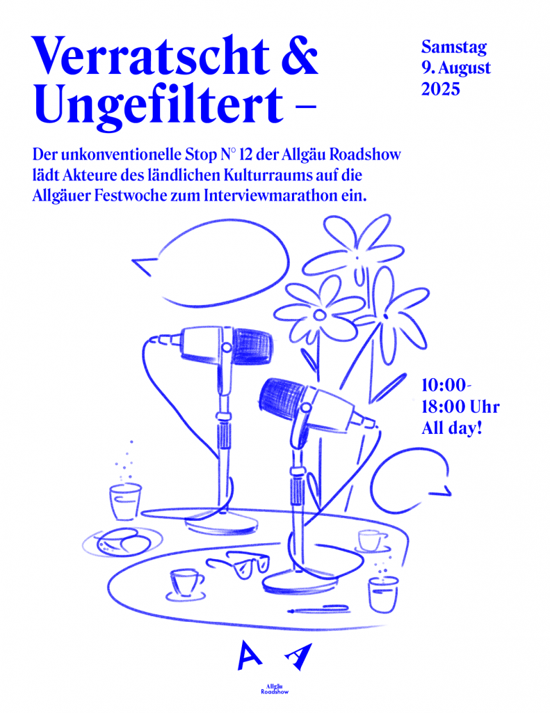 Mit dem Format »Allgäu Roadshow« haben die Atelier Werkstatt und das Atelier Brieftaube im Sommer 2020 ein Projekt mit offenem Reiseziel gestartet. Wir freuen uns, dass unsere Einladung von Beginn an wunderbare Initiativen begeistert hat. Auf unserer gemeinsamen Reise quer durch die Kunst- und Kulturlandschaft des Allgäus durften wir neue unabhängige Kulturräume, Projekte und die Köpfe dahinter näher kennenlernen. Das offene Netzwerkformat legt den Fokus auf die lebendige rurale Kulturszene und den persönlichen Austausch. Unterwegs in der geographischen Region Allgäu suchen wir neue Ideen, Aktionen und Räume auf. Die Ansätze der verschiedenen Plattformen außerhalb von klassischen Kulturinstitutionen und Strukturen öffnen dabei ihre Türen für Diskurse und porträtieren eine erfrischend vielschichtige Landschaft.